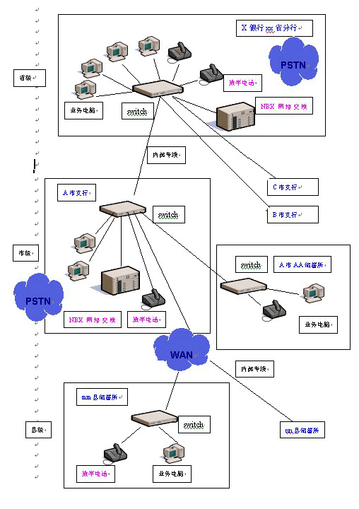 在銀行的省、市級(jí)分行分別部署一臺(tái)NBX網(wǎng)絡(luò)交換機(jī)——只需通過接入銀行系統(tǒng)內(nèi)部局域網(wǎng),經(jīng)過簡(jiǎn)單的配置即可使用。然后根據(jù)需要,在市內(nèi)各個(gè)儲(chǔ)蓄所、各縣級(jí)儲(chǔ)蓄所配置相應(yīng)數(shù)量的數(shù)字話機(jī),那么在全省內(nèi)各個(gè)縣市區(qū)的各個(gè)營業(yè)網(wǎng)點(diǎn)之間,上下級(jí)之間就都可以使用數(shù)字電話機(jī)通過數(shù)據(jù)網(wǎng)免費(fèi)撥打語音電話。