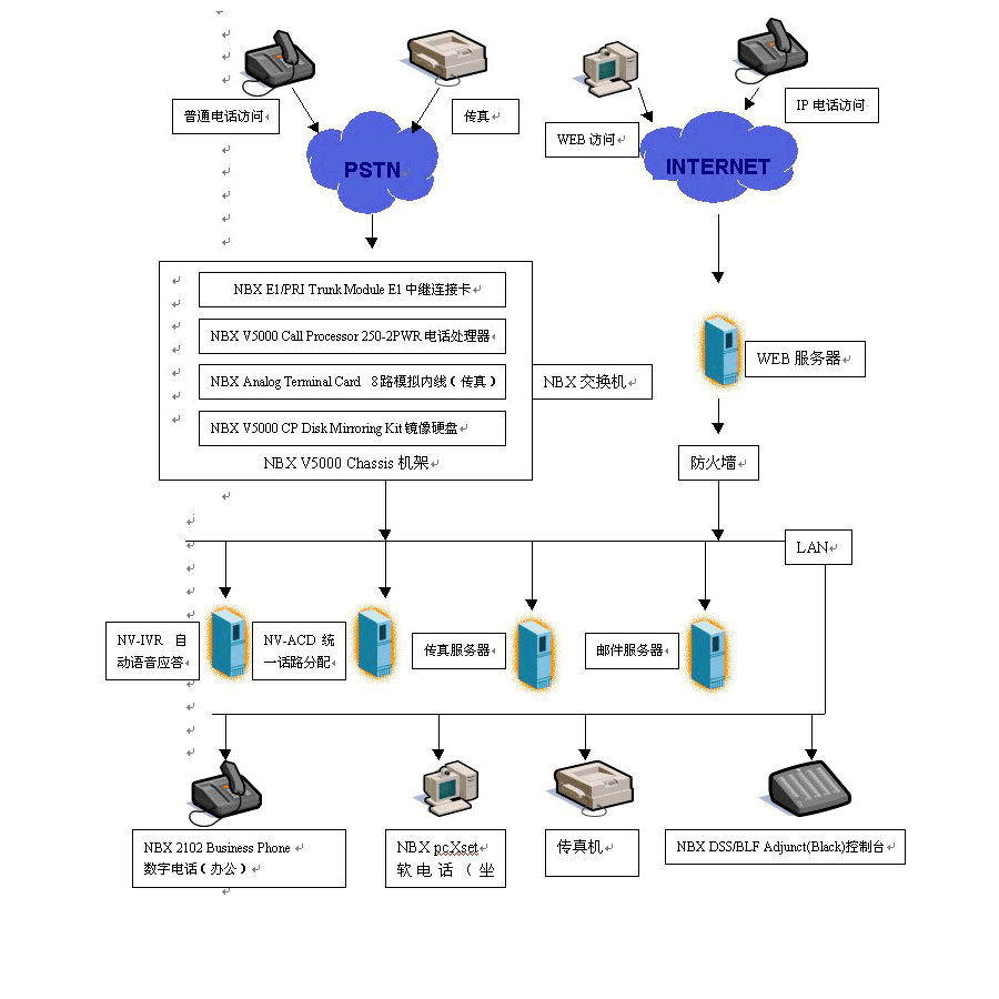 北京晨報(bào)的客戶服務(wù)中心項(xiàng)目是一個(gè)集呼叫中心與辦公系統(tǒng)于一體的語音、數(shù)據(jù)服務(wù)平臺。通過一條E1中繼線與外部電話網(wǎng)相聯(lián)。內(nèi)部使用50部數(shù)字電話進(jìn)行處理辦公業(yè)務(wù),10個(gè)呼叫中心坐席采用計(jì)算機(jī)的軟電話(pcXset)實(shí)現(xiàn)與客戶的交談,傳真服務(wù)器通過NBX所提供的8條模擬內(nèi)線與外界互通。