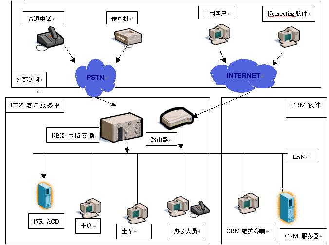 NBX客戶服務中心是基于3Com公司的NBX網(wǎng)絡電話交換機平臺構筑的新一代呼叫中心,首先它擴大了服務方式,客戶不但可以通過電話得到服務,還可以在上網(wǎng)訪問企業(yè)主頁的同時使用耳機、麥克風直接與服務代理人員(AGENT)語音通話,一邊瀏覽網(wǎng)頁,一邊交談,增加交流的信息輔助量。還可以通過電子郵件、傳真等方式完成與企業(yè)信息交流,其次NBX客戶服務中心內部數(shù)據(jù)、語音兩網(wǎng)合一的布線結構,不但提高了呼叫中心的穩(wěn)定性,而且使客戶數(shù)據(jù)能與電話語音同步協(xié)調,完成具有針對性的一對一的客戶服務。