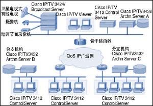在企業(yè)總部配置Cisco IP/TV 3424或3425視頻廣播服務(wù)器,可以對(duì)公司的培訓(xùn)進(jìn)行現(xiàn)場(chǎng)攝像的同時(shí),將這些節(jié)目通過(guò)網(wǎng)絡(luò)進(jìn)行現(xiàn)場(chǎng)直播。因?yàn)槭褂肐P組播多點(diǎn)發(fā)送技術(shù),廣播服務(wù)器可以進(jìn)行現(xiàn)場(chǎng)直播,在一路節(jié)目占據(jù)一個(gè)帶寬流的情況下,將此節(jié)目發(fā)送到企業(yè)范圍內(nèi)的各個(gè)分支機(jī)構(gòu),減少了對(duì)網(wǎng)絡(luò)資源的額外占用。IP/TV廣播服務(wù)器支持廣泛的CODEC:從高質(zhì)量的MPEG-1(500kbps-1.5Mbps)及中質(zhì)量的H.261(128kbps-500Kbps)到低比特率的56kbps視頻,都可以充分滿足質(zhì)量與帶寬的要求。在總部配置Cisco