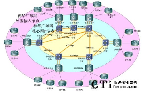 據(jù)神華集團信息管理部廣域網(wǎng)項目負責人說:“該項目建成后將是一個建設(shè)在高速傳輸網(wǎng)平臺之上,并利用其提供的線路構(gòu)成廣域網(wǎng)核心節(jié)點之間的互聯(lián)線路,網(wǎng)絡(luò)拓撲在7個核心節(jié)點和以北京節(jié)點為中心直連7個核心節(jié)點的放射型622M環(huán)形+放射混合性企業(yè)頂級骨干廣域數(shù)據(jù)網(wǎng)絡(luò)結(jié)構(gòu)。該網(wǎng)絡(luò)結(jié)構(gòu)可避免任一段光纜中斷造成某節(jié)點直連線路和環(huán)線同時中斷的可能性,即對網(wǎng)絡(luò)單點故障實現(xiàn)環(huán)路保護。同時,網(wǎng)絡(luò)中斷到恢復(fù)的周期大大縮短:傳輸系統(tǒng)中SDH的環(huán)路自愈從中斷到恢復(fù)周期為50ms,網(wǎng)絡(luò)節(jié)點之間通過IGP的路由收斂,從中斷到恢復(fù)的周期約為200ms。”