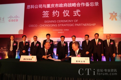 CTI論壇(ctiforum)9月14日消息:2009年9月11日,重慶市人民政府與思科正式簽訂合作備忘錄,雙方將結(jié)為戰(zhàn)略合作伙伴關(guān)系,就通信產(chǎn)品制造、“智能+互聯(lián)城市”試點示范、綠色技術(shù)研發(fā)與創(chuàng)新及風(fēng)險投資等多方面展開深入合作。此次合作將進(jìn)一步加快重慶市產(chǎn)業(yè)結(jié)構(gòu)和產(chǎn)品結(jié)構(gòu)調(diào)整,促進(jìn)內(nèi)陸開放城市建設(shè);加快發(fā)展重慶通信產(chǎn)品產(chǎn)業(yè)集群,把重慶建設(shè)成為西部重要的現(xiàn)代通信產(chǎn)品制造基地;推動以信息產(chǎn)業(yè)為主體的重慶高新技術(shù)產(chǎn)業(yè)發(fā)展以及本土創(chuàng)新和可持續(xù)性能力的提供,更高效便捷地加快本土企業(yè)的國際化進(jìn)程;整合多方國際資源,以推進(jìn)重慶在中國率先成為“智能+互聯(lián)城市”,讓市民享受更多的工作和生活便利及實惠。作為思科在華創(chuàng)新及可持續(xù)發(fā)展戰(zhàn)略實施的又一里程碑,此次合作不僅是思科“智能+互聯(lián)城市”計劃在中國與當(dāng)?shù)卣氖锥群献黜椖,也是思科在“協(xié)作型創(chuàng)新模式”指導(dǎo)下激勵本土創(chuàng)新的全新實踐。