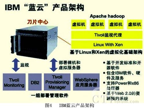 通過(guò)IBM的技術(shù)白皮書,我們可以一窺藍(lán)云計(jì)算平臺(tái)的內(nèi)部構(gòu)造!八{(lán)云”建立在IBM大規(guī)模計(jì)算領(lǐng)域的專業(yè)技術(shù)基礎(chǔ)上,基于由IBM軟件、系統(tǒng)技術(shù)和服務(wù)支持的開(kāi)放標(biāo)準(zhǔn)和開(kāi)源軟件。簡(jiǎn)單地說(shuō),“藍(lán)云”基于IBM Almaden研究中心(Almaden Research Center)的云基礎(chǔ)架構(gòu),包括Xen和PowerVM虛擬化、Linux操作系統(tǒng)映像以及Hadoop文件系統(tǒng)與并行構(gòu)建。“藍(lán)云”由IBM Tivoli軟件支持,通過(guò)管理服務(wù)器來(lái)確;谛枨蟮淖罴研阅。這包括通過(guò)能夠跨越多服務(wù)器實(shí)時(shí)分配資源的軟件,為客戶帶來(lái)一種無(wú)縫體驗(yàn),加速性能并確保在最苛刻環(huán)境下的穩(wěn)定性。IBM新近發(fā)布的“藍(lán)云(Blue Cloud)”計(jì)劃,能夠幫助用戶進(jìn)行云計(jì)算環(huán)境的搭建。它通過(guò)將Tivoli、DB2、WebSphere與硬件產(chǎn)品(目前是x86刀片服務(wù)器)集成,能夠?yàn)槠髽I(yè)架設(shè)一個(gè)分布式、可全球訪問(wèn)的資源結(jié)構(gòu)。根據(jù)IBM的計(jì)劃,首款支持Power和x86處理器刀片服務(wù)器系統(tǒng)的“藍(lán)云”產(chǎn)品將于2008年正式推出,并且計(jì)劃隨后推出基于System z“大型主機(jī)”的云環(huán)境,以及基于高密度機(jī)架集群的云環(huán)境。