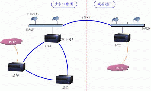 大長江集團(tuán)采用佳和融合通信系統(tǒng)設(shè)備,組建集團(tuán)的電話通信網(wǎng)絡(luò),并與合作伙伴“減震器廠”也實現(xiàn)了組網(wǎng),網(wǎng)絡(luò)拓?fù)鋱D如下: