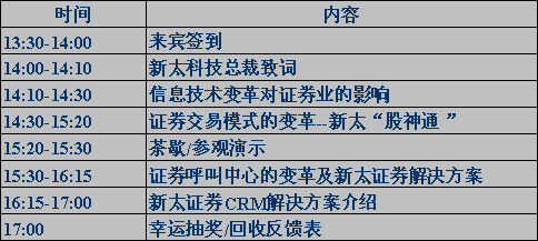現(xiàn)誠邀您參加新太“股神通“產(chǎn)品發(fā)布會暨證券業(yè)務(wù)解決方案研討會,新太科技愿與您共同迎接證券業(yè)面臨的挑戰(zhàn)與機(jī)遇。