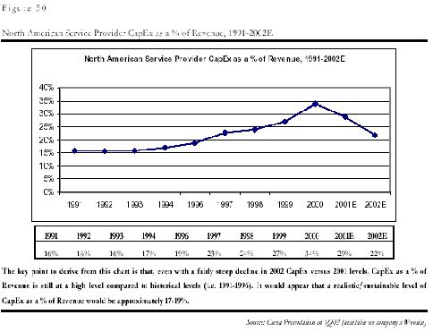 和中國的問題一樣,制造商的問題是電信服務(wù)企業(yè),即運(yùn)營商的投入減少造成的。由于上世紀(jì)末互聯(lián)網(wǎng)和電子商務(wù)泡沫的虛假繁榮的影響,各運(yùn)營商都嚴(yán)重高估了市場需求,認(rèn)為需求是會(huì)隨著通信能力的增強(qiáng)無限增加,因此市場規(guī)模是會(huì)無限擴(kuò)張的,他們在缺乏對最終用戶需求的深入分析的前提下,普遍在基礎(chǔ)設(shè)施的建設(shè)上進(jìn)行了超大規(guī)模的投入,其基礎(chǔ)設(shè)施建設(shè)投入在收入中的比例一度在2000年從平均的15%達(dá)到了創(chuàng)記錄的35%!
