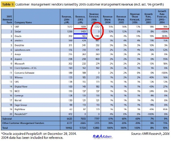 從圖中可以看出,2005年SAP CRM的全球營收為19.08億美元,Oracle+Siebel(PeopleSoft已計(jì)入Oracle)CRM的全球營收為18.69億美元,落后于SAP CRM。ARM Research的預(yù)計(jì),SAP CRM在2006的營收將達(dá)22.52億美元,而Oracle Siebel則只有17.85億美元。