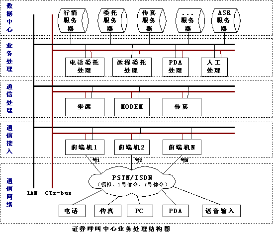 另一種方案是PDA和證券營業(yè)部前端機(實際就是電話委托前端機)采用FSK通訊方式,使用電話委托的通道來完成所有的委托查詢。這種方式的速度快,信息容量大,保密性強,而且營業(yè)部不需單獨申請電話線路,PDA和電話委托線路可動態(tài)分配,使其電話線路得到最大限度的利用。另外,營業(yè)部對外形象也好,只用一個號碼就可讓股民完成電話委托、PDA委托等多種委托方式,給股民帶來了方便。不過這種方式需要得到電話語音卡提供廠商的產(chǎn)品技術(shù)支持,語音卡必須同時支持標準的DTMF和FSK的方式,卡上有充足的能力來處理兩種方式,在語音處理卡的底層驅(qū)動應(yīng)該將電話和PDA的委托區(qū)別開來,目前市場能夠完全支持這種應(yīng)用的只有深圳市東進通訊技術(shù)股份有限公司的產(chǎn)品,東進技術(shù)的新一代PCI系列語音卡數(shù)字卡和模擬卡都完全采用DSP(數(shù)字信號處理器)架構(gòu),卡上有專用DSP來處理DTMF和FSK的收發(fā),是目前PDA委托前端的最好選擇;這種方案還應(yīng)該得到證券電話委托系統(tǒng)的開發(fā)商的支持,在電話委托系統(tǒng)里增加處理PDA委托的功能。目前恒基偉業(yè)的“股靈通”就是采用這種方式。