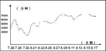 延吉通信從7月10日開始正式作宣傳,8月1日后每天時(shí)長(zhǎng)均保持在55000分鐘以上。最新統(tǒng)計(jì)表明,自2002年7月至今,該業(yè)務(wù)已為延吉通信公司創(chuàng)造2500萬(wàn)分鐘以上的市話增值。