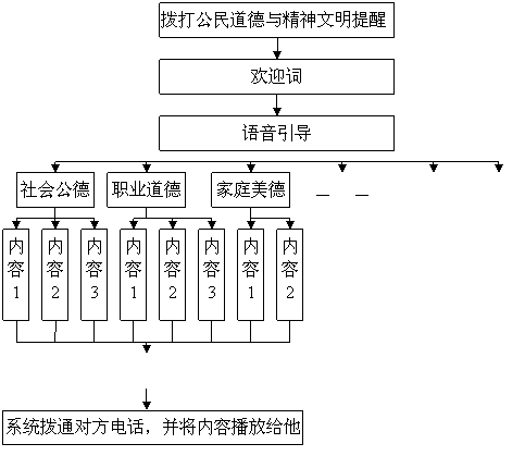 例如,某位公民對(duì)他(她)的鄰居或者同事一些不文明的行為(如深夜打麻將,亂倒垃圾,不講衛(wèi)生,破壞公物……)感到有必要進(jìn)行善意的提醒,但是,又覺(jué)得直接對(duì)他(她)說(shuō)不合適,因?yàn)楫吘闺p方很熟悉或者還要共事,如果直接對(duì)對(duì)方進(jìn)行批評(píng)可能會(huì)引起對(duì)方的反感,即使對(duì)方認(rèn)為自己做的不對(duì),也會(huì)感到很尷尬,很失面子,在這種情況下,這為公民可以撥打“社區(qū)道德與精神文明提醒熱線”,選取熱線內(nèi)預(yù)先已經(jīng)錄制好,經(jīng)過(guò)審定的錄音內(nèi)容,選取內(nèi)容后輸入對(duì)方的電話號(hào)碼,熱線系統(tǒng)就可以將這段錄音播放給對(duì)方聽,對(duì)方聽到之后就會(huì)意識(shí)到或者思考自己的行為里面有沒(méi)有不文明的行為,同時(shí)會(huì)相應(yīng)的約束自己的行為。但是在此過(guò)程中對(duì)方并不知道為他(她)點(diǎn)播這段錄音的人的電話號(hào)碼,從而也不知道是誰(shuí)給她留的錄音。當(dāng)然,還可以通過(guò)電子郵件或者手機(jī)短消息的方式對(duì)他(她)進(jìn)行提醒。