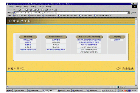 ebanswers分銷(xiāo)系統(tǒng)的一個(gè)重要特色就是自助管理平臺(tái),用戶(hù)可以在這個(gè)平臺(tái)中完成絕大部分管理、查詢(xún)和統(tǒng)計(jì)的工作。自助管理平臺(tái)主要有四大部分組成:帳號(hào)管理、公司下訂單和庫(kù)存管理、帳號(hào)下訂單和庫(kù)存管理、其他功能。其中帳號(hào)管理主要是管理與公司和帳號(hào)有關(guān)的各類(lèi)信息,公司下訂單和庫(kù)存管理、帳號(hào)下訂單和庫(kù)存管理這兩個(gè)部分主要是用來(lái)查詢(xún)和統(tǒng)計(jì)各項(xiàng)信息的。