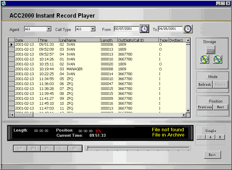 ACC2000 多媒體溝通中心采用最先進(jìn)的海量存儲(chǔ)設(shè)備DVD RAM構(gòu)建實(shí)時(shí)多通道語音錄制、備份系統(tǒng)��ACC2000 DVD Record Backup。這個(gè)系統(tǒng)可以根據(jù)管理員設(shè)定的錄音對(duì)象,對(duì)符合錄音條件的通話自動(dòng)進(jìn)行錄音。