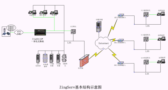 硬件:中心有ZingSwitch®,O口網(wǎng)關和內(nèi)線卡。座席端配置S口網(wǎng)關。