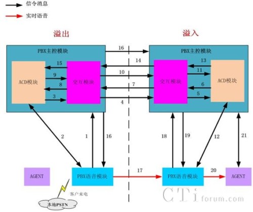 通過PBX/ACD建立一種電話路由共享和語音溢出的方法,實現(xiàn)多套聯(lián)絡(luò)中心平臺之間語音的動態(tài)互溢,透明地為客戶提供優(yōu)質(zhì)、及時的電話服務(wù),客戶感覺不到任何差異。通過PBX/ACD建立一種電話路由共享和語音溢出的方法,作為行業(yè)現(xiàn)有實現(xiàn)方法的有效補充,解決了行業(yè)現(xiàn)有實現(xiàn)方法的無法實現(xiàn)最短路徑溢出問題,通過ACD的“先排隊后進門”的預(yù)約預(yù)定模式,動態(tài)判斷彼此的運行狀態(tài)和處理能力,無需先將語音溢出到另外一個聯(lián)絡(luò)中心,只有當(dāng)另外一個聯(lián)絡(luò)中心確定能提供相應(yīng)的語音服務(wù)和人工服務(wù)的時候,語音才在PBX語音層面通過標(biāo)準(zhǔn)通信協(xié)議進行互聯(lián)互通,避免實時語音被多次溢出,實時實時語音溢出只走最短路徑,保證客戶電話只需一次溢出就能立即提供語音服務(wù)和人工服務(wù),大幅減少了語音溢出的處理時間,同時也大幅減少了語音處理次數(shù),提升了系統(tǒng)處理性能。