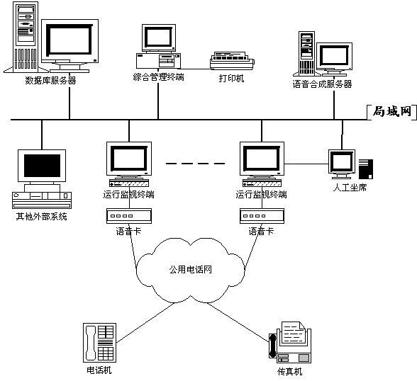 管理終端通道設(shè)置、業(yè)務(wù)內(nèi)容設(shè)置、操作人員管理,打印各種報(bào)表、報(bào)警數(shù)據(jù)。上面安裝綜合管理子系統(tǒng),操作系統(tǒng)為Windows 95/98/2000。