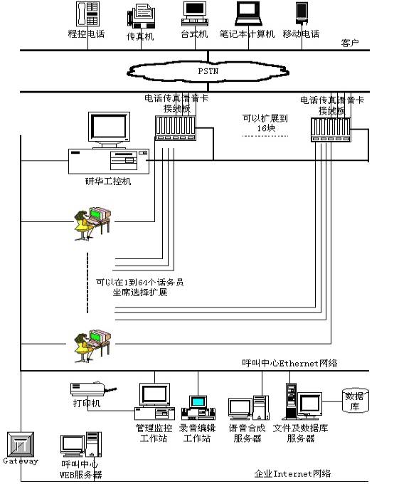 硬件主要由電話接口工控機(內(nèi)部的安裝電話語音卡)、主服務器、管理計算機、人工坐席計算機、電話機(包括頭戴耳麥)、計算機網(wǎng)絡連接設備和電話線路連接設備組成。