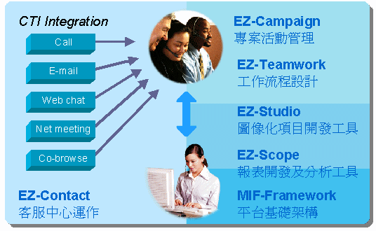 EZactor模塊化的設計與Web-based的組織結構,不僅為客服中心的信息人員提供了彈性大、客制化容易的模塊與接口,不需另行編寫其它應用程序,節(jié)省了程序開發(fā)時間;也為客服中心的第一線人員提供使用容易與功能強大的客戶關系管理系統(tǒng)。