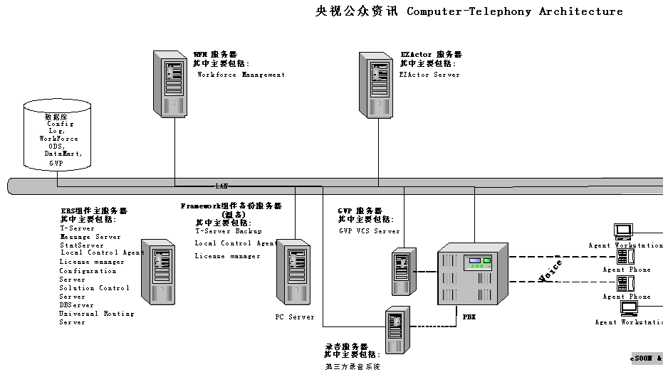 針對CCTV公眾資訊中心系統(tǒng)平臺更新改造的要求,eSOON公司提供的解決方案包括EZactor CRM產品 & Genesys CTI/GVP產品。
