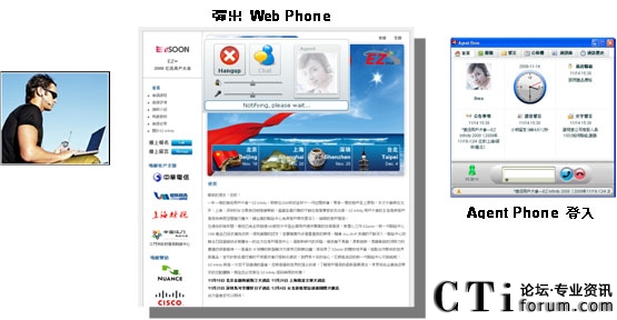 聲音和影像是最有力的溝通媒介。網(wǎng)絡(luò)商務(wù)雖然行之有年,卻無(wú)法突破實(shí)時(shí)影音溝通障礙,經(jīng)營(yíng)者也常因此錯(cuò)失銷售良機(jī)。億迅EZPhone打通Web to IP影音通信任督二脈,為企業(yè)注入廣大互聯(lián)網(wǎng)用戶的心聲。電子服務(wù)部門接受的不再是無(wú)聲的請(qǐng)求,而是在線,熱切,激動(dòng)的期盼,實(shí)在的聲音。它輕薄短小卻威力無(wú)窮,以 Click-to-Call一點(diǎn)即通方式,讓 CESS 概念隨著公司的觸角延伸到全世界的范圍。網(wǎng)絡(luò)用戶不必下載插件,不用打開(kāi)防火墻,不必付話費(fèi),可即刻點(diǎn)擊網(wǎng)絡(luò)電話進(jìn)行通話;此外EZPhone還可以接通傳統(tǒng)電話與IP電話,為企業(yè)節(jié)省龐大的話費(fèi)。EZPhone適合方案多不枚舉: