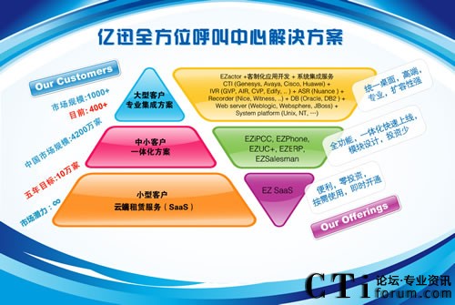 Service Software”;而“易之愛彼喜喜”及“易之風”產(chǎn)品,顧名思義,就是億迅推出基于CESS理念的呼叫中心產(chǎn)品EZIPCC及EZPhone的中文注釋,因為簡單容易,讓客戶更喜歡;“CHANGE”不僅代表了億迅發(fā)展的這11年一直秉持創(chuàng)新與改革的經(jīng)驗哲學,也代表了億迅自主研發(fā)的核心CRM產(chǎn)品“EZactor”在高端市場與主流戰(zhàn)略合作伙伴的關(guān)系,其中的“C”,是指CISCO;“H”指Huawei;“A”指“AVAYA”;“N”指Nuance;“G”指Genesys;而最后的“E”,則代表了eSOON。