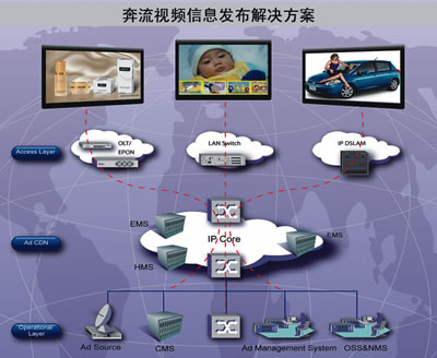 UT斯達(dá)康緊跟市場(chǎng)發(fā)展趨勢(shì)和運(yùn)營(yíng)商步伐,深入研究戶外液晶廣告業(yè)務(wù)的發(fā)展、大力推進(jìn)廣告平臺(tái)的研發(fā)。2006年,UT斯達(dá)康推出了奔流(RollingStream)視頻信息發(fā)布解決方案(如圖2所示)。奔流視頻信息發(fā)布解決方案是以奔流(RollingStream)IPTV平臺(tái)為基礎(chǔ),結(jié)合戶外液晶廣告市場(chǎng)需求,融合運(yùn)營(yíng)商以視頻為主的綜合信息發(fā)布的需求,真正運(yùn)營(yíng)級(jí)的電信級(jí)解決方案。該方案可以幫助運(yùn)營(yíng)商實(shí)現(xiàn)融合信息服務(wù)和廣告業(yè)務(wù)的統(tǒng)一運(yùn)營(yíng),幫助運(yùn)營(yíng)商開展兼具公益性和盈利性的信息發(fā)布業(yè)務(wù),運(yùn)營(yíng)商在推進(jìn)社會(huì)信息化、造福公眾的同時(shí),通過視頻廣告的運(yùn)營(yíng),也能獲取盈利。該方案基于電信級(jí)平臺(tái)的穩(wěn)定性、安全性、擴(kuò)展性設(shè)計(jì)要求,可支持百萬級(jí)大規(guī)模部署能力,可提供電信級(jí)質(zhì)量保證的服務(wù);該方案基于IP流媒體技術(shù),可通過IP網(wǎng)絡(luò)實(shí)時(shí)、精準(zhǔn)、互動(dòng)地投放廣告內(nèi)容,從而可以支持豐富、新穎的廣告運(yùn)營(yíng)模式;該方案基于數(shù)字多媒體技術(shù),除了可以發(fā)布視頻廣告,還可以發(fā)布圖片、文字、消息等廣告內(nèi)容。