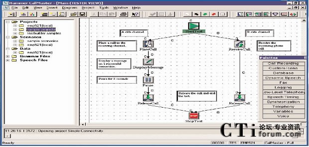 呼叫中心測試的第一步就是要創(chuàng)建要被測試的業(yè)務(wù)的呼叫流程圖?梢酝ㄟ^一個含有標(biāo)準(zhǔn)呼叫流程圖標(biāo)庫的呼叫流程圖形編輯器創(chuàng)建呼叫流程圖。每個呼叫流程的圖標(biāo)都包含一段Hammer