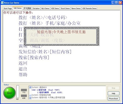 Nuance:可以修改。到你需要修改的那個“見”上,你再說“見”或者見面,它就給你弄過來了。但是我們覺得在中國區(qū),在中文的修改上,這未必可能是個好辦法,我們也在試探另外一種辦法,這個辦法我現(xiàn)在可以給大家介紹一下。就是這樣,我要說修改,那么那個語音合成TS就開始給你再讀,剛才不是讀了一遍嗎,它再給你讀,但是這一次讀,它是一個詞一個詞地讀。他說,今天我不吭聲,晚上,我不吭聲,他說七點,我也不吭聲,等他說“見”的時候,我說“見面”,他知道我說的這個詞要把那個覆蓋掉,再改,再把它改了。這樣可能更合理一些,就是你手不用去摸什么東西,眼睛看什么東西,完全能保持你在駕駛的時候,這是我們目前還在進行開發(fā)的一個東西,或許下一次如果我們再有機會我們就可以把這個演示一下。