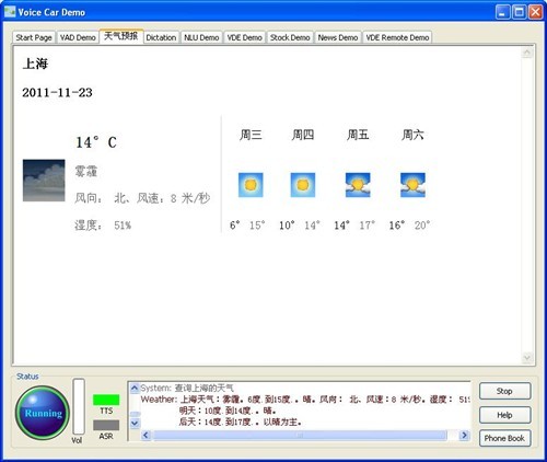比方說這個關于空調(diào)問題,我們過去,空調(diào)的命令詞是“把空調(diào)打開,空調(diào)溫度提高3度!爆F(xiàn)在我也可以這樣說,空調(diào)調(diào)高一點,我有點冷,也可以。就是你在車里邊完全可以用你自己的語言來說你想干的事。比如說,前邊你不知道明天天氣會怎么樣,人一般都會想想,明天天氣如何,或者是告訴我天氣預報。但是你也可以這樣說。明天會下雨嗎?也可以這樣說;蛘吣氵@樣說,你說,今天大盤怎么樣。完全是用自然語言來說。堵不堵車,“查詢交通情況。”這就是,實際上可以有各種不同的說法來完成這個任務,這是我們自然語言的一個演示。