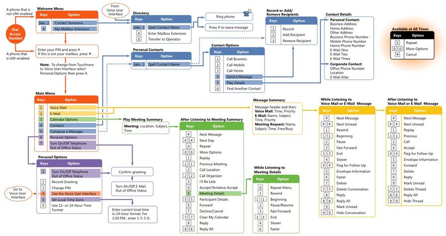 允許用戶通過電話處理他們的消息和日歷數(shù)據(jù)(包括收聽、轉(zhuǎn)發(fā)和回復電子郵件,以及發(fā)出、更新或響應(yīng)會議請求)。用戶可以標記消息以便跟蹤、跳到下一封未讀郵件、隱藏或刪除對話,甚至查找來自特定用戶的消息,這一切全都使用語音導航或標準按鍵式鍵盤來完成。