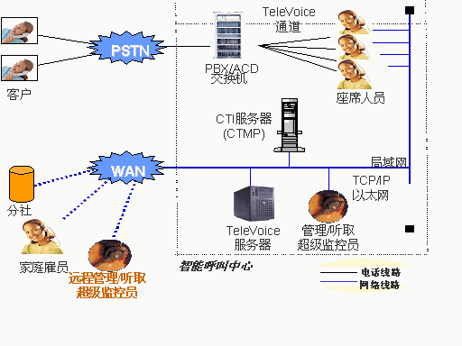 遠程家庭辦公雇員支持:錄音裝備和家庭辦公雇員個人電腦之間,通過專用線、ADSL 或 ISDN 等, 甚至把在家進行的通話內(nèi)容存放到總部的服務(wù)器中做錄音保存和控制