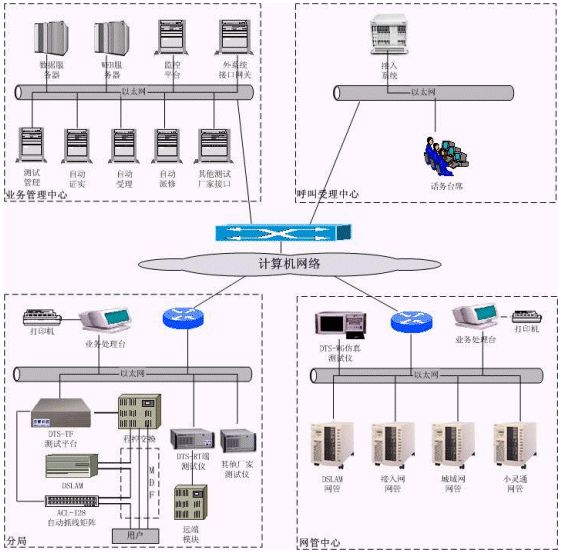 ·DTS-TF大容量測試平臺實現(xiàn)對多種不同交換機類型的外部測試及模塊局仿真測試;DTS-ADSL測試儀,實現(xiàn)ADSL開通之前的線路評估測試、ADSL開通之后的日常例行測試和ADSL故障立即測試;DTS-WG仿真測試儀,通過網管協(xié)議實現(xiàn)對接入網、LAN城域網、PHS小靈通等設備的故障定位;ACL-128自動抓線矩陣,提供128端口的自動抓線,級聯(lián)可達32,768條線路。