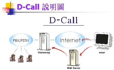 由金倚公司在貴網(wǎng)站的網(wǎng)頁(yè)上安裝D-CALL軟件,并配上金倚公司開發(fā)的硬件,將您網(wǎng)站要指定D-CALL 直撥的電話號(hào)碼或分機(jī)設(shè)定在D-CALL程序中,就可以享受D-CALL的功能了。(需要的環(huán)境如右圖示
