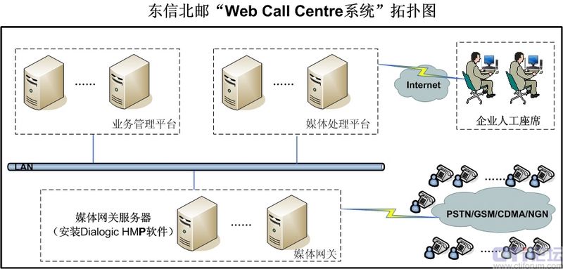 隨著中國經(jīng)濟(jì)的快速發(fā)展,越來越多的企業(yè)尤其是中小企業(yè)對呼叫中心的需求量越來越大,需求質(zhì)量也越來越高。由于呼叫中心建設(shè)涉及技術(shù)十分專業(yè)、涉及領(lǐng)域也比較廣泛、必須投入巨大的資金購買軟硬件設(shè)備,并且需要大量的維護(hù)力量,因此對于中小企業(yè),尤其是缺乏專業(yè)技術(shù)力量和資金的中小企業(yè)來說,建設(shè)自有的呼叫中心顯得不切實際。正是基于這種情況,EB開始與Dialogic合作,采用其HMP系統(tǒng)軟件,以IP技術(shù)為基礎(chǔ),依托電信網(wǎng)絡(luò),建設(shè)呼叫中心系統(tǒng),以托管方式為客戶提供呼叫中心服務(wù),即Web Call Centre服務(wù)。