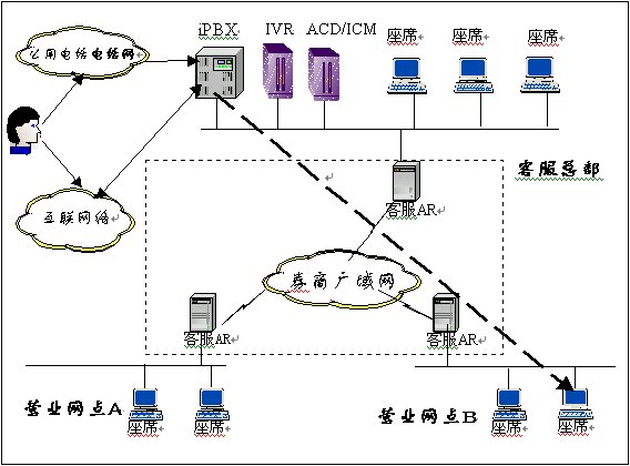 在總部設(shè)立集中的客戶服務(wù)中心完成對(duì)全網(wǎng)的人工座席的管理和調(diào)度,由總部的ACD完成對(duì)全網(wǎng)人工業(yè)務(wù)的呼叫分配,借助廣域網(wǎng)絡(luò),實(shí)現(xiàn)話務(wù)在區(qū)域范圍內(nèi)的接續(xù)。在座席配置上既可以采用集中配置,各營(yíng)業(yè)部分散配置專家座席的方式。