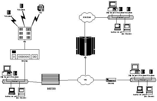 該應(yīng)用示意圖具有一個(iPBX )或多個辦公場地(nIPBX - 組網(wǎng)iPBX )提供電話系統(tǒng)解決方案。該解決方案是基于IP 電話技術(shù)而構(gòu)建的Tw-IPBX “一體化概念”,同時可提供傳統(tǒng)的模擬電話概念,如模擬電話和傳真機(jī)。以下敘述了客戶機(jī)組合的單獨(dú)應(yīng)用場景,包括: