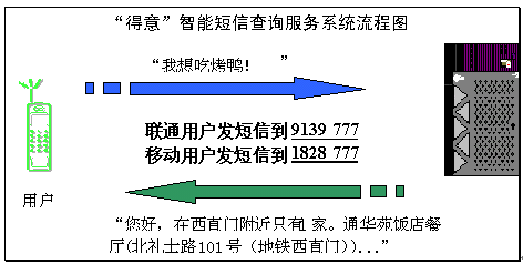 2004年4月15日和4月20日,擁有完全自主知識產(chǎn)權(quán)的語音與語言技術(shù)開發(fā)商和技術(shù)提供商北京得意音通技術(shù)有限責任公司(得意公司),在國際上率先把中文自然語言理解技術(shù)應(yīng)用在中國聯(lián)通和中國移動短信服務(wù)平臺上,結(jié)合《精品購物指南》報社權(quán)威、全面的信息資源,開通了北京地區(qū)餐飲領(lǐng)域智能短信查詢服務(wù)(簡稱智能短信),并將進一步支持互聯(lián)網(wǎng)平臺和WAP平臺,陸續(xù)開通更豐富和更實用的智能信息服務(wù)。