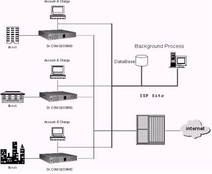 本文提出的方案就是采用第二種方案設(shè)計(jì)的。所采用的互聯(lián)網(wǎng)接入服務(wù)器就是一臺(tái)Dr.COM(通訊博士) 2033 BMG 計(jì)費(fèi)管理網(wǎng)關(guān),每個(gè)客人入住登記時(shí),如果需要申請(qǐng)開通互聯(lián)網(wǎng)服務(wù),服務(wù)員開通一個(gè)賬號(hào),由客人自己輸入一個(gè)密碼。客人就可以在房間使用自己的手提電腦或酒店提供的電腦,通過酒店的局域網(wǎng)訪問互聯(lián)網(wǎng)。等客人結(jié)賬離開前,可以打印出上網(wǎng)的詳細(xì)紀(jì)錄,作為客人的結(jié)賬單。也可以提供一個(gè)賬單紀(jì)錄的數(shù)據(jù)出口,連接到酒店的服務(wù)器,由酒店的服務(wù)器進(jìn)行計(jì)費(fèi)管理。