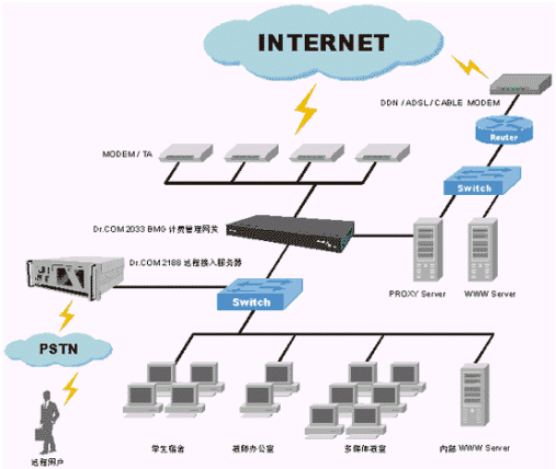 本方案才用Dr.COM 2188遠(yuǎn)程接入服務(wù)器,提供了內(nèi)置的15個(gè)MODEM用作遠(yuǎn)程接入,配套提供專業(yè)開(kāi)戶、計(jì)費(fèi)、統(tǒng)計(jì)、監(jiān)視和查詢等網(wǎng)絡(luò)版營(yíng)運(yùn)軟件。為校園網(wǎng)未能到達(dá)的地方的用戶(如教師宿舍里的用戶等)提供訪問(wèn)校園網(wǎng)內(nèi)部資源的途徑,另外也對(duì)學(xué)校開(kāi)展電子圖書(shū)館服務(wù)提供有力的支持,外部的用戶可以通過(guò)遠(yuǎn)程接入校園網(wǎng)內(nèi)的電子圖書(shū)館的資料,學(xué)校則可以利用2188的計(jì)費(fèi)系統(tǒng)對(duì)此進(jìn)行收費(fèi)。