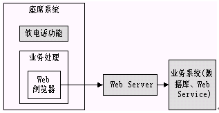 從上圖可以看出,座席端所有的業(yè)務(wù)處理都是在Web瀏覽器上進(jìn)行的,所以無(wú)論是利用原有系統(tǒng)還是新開(kāi)發(fā)系統(tǒng),用戶都不必要關(guān)心座席的具體實(shí)現(xiàn)方式,要做的僅僅是編寫(xiě)新的JSP,ASP等可訪問(wèn)后臺(tái)業(yè)務(wù)的Web頁(yè)面,然后進(jìn)行簡(jiǎn)單的配置就可以完成業(yè)務(wù)的擴(kuò)充功能。