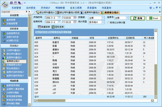 座席綜合統(tǒng)計(jì):可以根據(jù)“月份”、“天”、“小時(shí)”來統(tǒng)計(jì)每一個(gè)座席的綜合指標(biāo)。統(tǒng)計(jì)的指標(biāo)包括:總登錄時(shí)長、空閑時(shí)長、呼入電話數(shù)、呼入時(shí)長、平均呼入時(shí)長、呼出電話數(shù)、呼出時(shí)長、平均呼出時(shí)長、通話總數(shù)、通話總時(shí)長、后處理時(shí)長、平均后處理時(shí)長、AUX總時(shí)長、電話振鈴時(shí)長、平均振鈴時(shí)長、轉(zhuǎn)移次數(shù)、磋商次數(shù)、保持次數(shù)、平均保持時(shí)長。