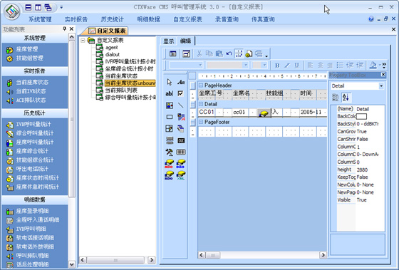 CMS是有效的對(duì)呼叫中心進(jìn)行監(jiān)視和管理的系統(tǒng)。它可以實(shí)時(shí)監(jiān)控整個(gè)呼叫中心的當(dāng)前數(shù)據(jù),按照座席、技能組、中繼線、隊(duì)列、路由進(jìn)行監(jiān)視,查看座席服務(wù)狀態(tài)及接通率各種指標(biāo),通過各項(xiàng)實(shí)時(shí)記錄和歷史記錄向用戶提供多種綜合分析報(bào)告和統(tǒng)計(jì)報(bào)告。其所生成的上百張報(bào)表,可以協(xié)助企業(yè)有效管理資源,檢查成本,預(yù)測(cè)改善現(xiàn)有運(yùn)作的潛在需求。并提供圖表顯示,生成Excel文檔進(jìn)行再編輯,或者通過標(biāo)準(zhǔn)的報(bào)表形式進(jìn)行編輯。支持自定義報(bào)表。