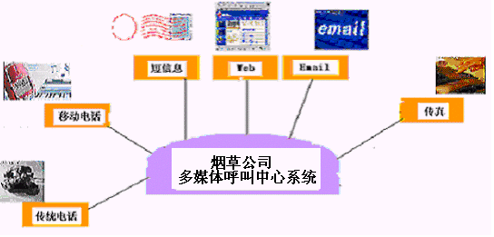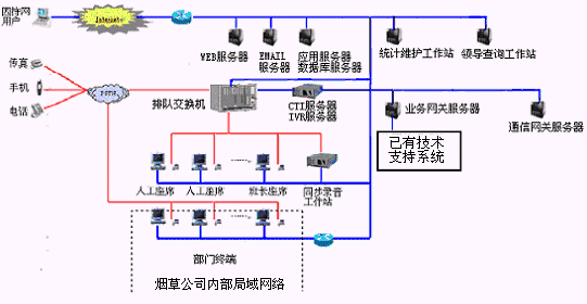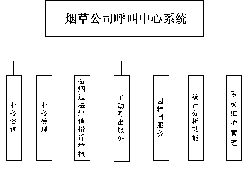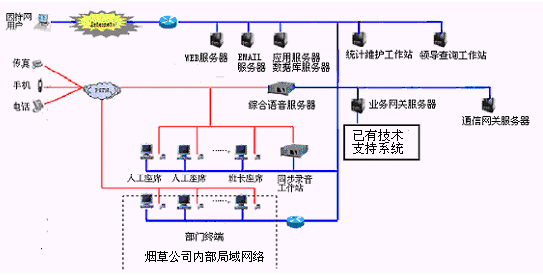 卷煙經(jīng)銷戶等客戶利用電話、傳真、電子郵件、因特網(wǎng)、手機(jī)、短消息等撥打統(tǒng)一的特服號(hào)碼(如800XXX或9XXXX)進(jìn)入煙草公司呼叫中心,本系統(tǒng)依托煙草公司各類業(yè)務(wù)技術(shù)支持系統(tǒng)和網(wǎng)絡(luò)系統(tǒng),實(shí)現(xiàn)煙草專賣(mài)局原有管理系統(tǒng)/業(yè)務(wù)系統(tǒng)及數(shù)據(jù)庫(kù)的無(wú)縫連接,通過(guò)人工受理或自動(dòng)語(yǔ)音服務(wù)等方式全天24小時(shí)不間斷地為客戶提供各種服務(wù)。