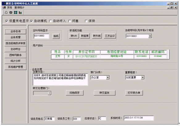 煙草公司呼叫中心將接入功能、導(dǎo)航功能、自動(dòng)語(yǔ)音查詢功能、人工座席服務(wù)功能、話路轉(zhuǎn)接功能、信息資料處理緊密聯(lián)系起來(lái)。用戶撥打特服電話號(hào)碼后,可以根據(jù)需要選擇人工服務(wù)、自動(dòng)語(yǔ)音查詢、自動(dòng)留言,并能夠在幾種服務(wù)中來(lái)回切換或轉(zhuǎn)接其它電話;所記錄的資料可以分門(mén)別類的進(jìn)行統(tǒng)計(jì)并形成報(bào)表,供相關(guān)部門(mén)進(jìn)行檢索查閱;意見(jiàn)處理完畢,可由座席主動(dòng)呼叫用戶,告知處理意見(jiàn),形成閉環(huán)處理流程。