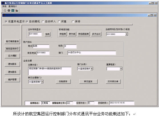航空集團(tuán)運(yùn)行控制部門分布式通訊平臺系統(tǒng)的軟件設(shè)計(jì)采用業(yè)界先進(jìn)的三層CLIENT/SERVER體系結(jié)構(gòu),集目前先進(jìn)的計(jì)算機(jī)技術(shù)、通信技術(shù)、計(jì)算機(jī)電信集成(CTI)技術(shù)、呼叫接入技術(shù)、智能接入交換分配技術(shù)、數(shù)字語音處理技術(shù)、異構(gòu)系統(tǒng)信息交互技術(shù)、安全容錯(cuò)技術(shù)、網(wǎng)絡(luò)組網(wǎng)技術(shù)等于一體,并與航空集團(tuán)運(yùn)行控制部門已有技術(shù)支持系統(tǒng)(如飛行運(yùn)行控制系統(tǒng)、航路計(jì)劃系統(tǒng))緊密結(jié)合在一起,突破時(shí)空的限制,通過人工座席、自動語音/傳真、相關(guān)部門工作人員等為集團(tuán)內(nèi)部提供電話、傳真服務(wù)形式的周到、快捷、全方位的通信服務(wù)。