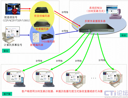 可通過單播或組播方式將會議現(xiàn)場的視頻、音頻、計算機動態(tài)屏幕在網(wǎng)絡上進行實時直播,用戶可通過IE瀏覽器登錄服務器實時接收直播的視頻、音頻和計算機動態(tài)屏幕內容。系統(tǒng)獨家支持組播代理功能,無須更改網(wǎng)絡設備的設置即可實現(xiàn)跨網(wǎng)段的組播。系統(tǒng)獨家支持文件組播功能,可將錄制好的文件在網(wǎng)絡上再次進行組播。