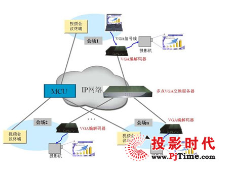 視頻會(huì)議系統(tǒng)帶外硬雙流解決方案的核心是基于IP網(wǎng)絡(luò)實(shí)現(xiàn)VGA信號(hào)的采集編碼、多點(diǎn)交換、解碼顯示。在本方案中,通過VGA編解碼器實(shí)現(xiàn)VGA信號(hào)的采集編碼及解碼顯示,VGA信號(hào)的多點(diǎn)交換則通過多點(diǎn)VGA交換服務(wù)器實(shí)現(xiàn),因采用硬件方式實(shí)現(xiàn)VGA信號(hào)的編解碼,且VGA信號(hào)流在視頻會(huì)議視音頻信號(hào)流之外傳送,故稱“帶外硬雙流”。采用帶外硬雙流解決方案,組網(wǎng)靈活,管理方便,可以配合任何制式及品牌的視頻會(huì)議實(shí)現(xiàn)雙流功能。