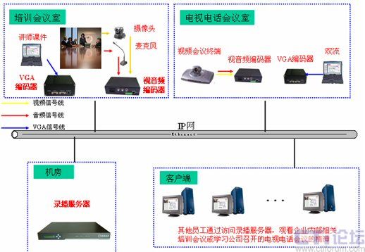 由于視頻會(huì)議系統(tǒng)沒有覆蓋公司內(nèi)所有的會(huì)議室,因此這些會(huì)議室召開的會(huì)議就無法進(jìn)行直播,而借助于多媒體錄播系統(tǒng)就可以很好的解決這一缺陷。通常將這些會(huì)議室中的攝像頭和麥克風(fēng)接入到視音頻編碼器上,將講師電腦上的培訓(xùn)課件(如PPT,Word等文檔)內(nèi)容接入到VGA編碼器上,兩者將采集到的信號(hào)通過網(wǎng)絡(luò)發(fā)給錄播服務(wù)器,由錄播服務(wù)器進(jìn)行處理后直播到各個(gè)客戶端,就可以很方面的對(duì)于任意一個(gè)會(huì)議室召開的會(huì)議進(jìn)行錄播,隨時(shí)隨地對(duì)員工傳達(dá)會(huì)議精神。