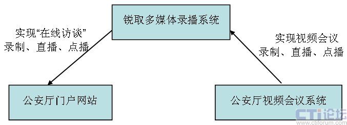 如圖所示,銳取多媒體錄播系統(tǒng)前端的視音頻編碼器采集視頻會(huì)議系統(tǒng)攝像機(jī)拍攝的公安機(jī)關(guān)領(lǐng)導(dǎo)或?qū)<以诰交流的視頻圖像和交流現(xiàn)場(chǎng)的聲音,將采集的視頻和音頻信號(hào)通過網(wǎng)絡(luò)傳輸?shù)胶笈_(tái)的多媒體錄播服務(wù)器中。服務(wù)器的錄制模塊將從視音頻編碼器接收到的信號(hào)進(jìn)行同步組合錄制,錄制的文件存儲(chǔ)在服務(wù)器的硬盤上。服務(wù)器的點(diǎn)播模塊調(diào)用硬盤中已錄制的文件實(shí)現(xiàn)點(diǎn)播功能。服務(wù)器的直播模塊將從視音頻編碼器接收到的信號(hào)分發(fā)到網(wǎng)絡(luò)上,需要觀看“在線訪談”直播視頻的網(wǎng)民只需登錄省公安廳政府門戶網(wǎng)站,安裝專用客戶端軟件就能接收到公安機(jī)關(guān)領(lǐng)導(dǎo)或?qū)<以诰交流的實(shí)時(shí)內(nèi)容。通過客戶端軟件的在線交流功能,觀看直播的網(wǎng)民還可以向公安機(jī)關(guān)領(lǐng)導(dǎo)或?qū)<姨釂,真正?shí)現(xiàn)了“在線訪談”貼近群眾、服務(wù)群眾的目標(biāo)。