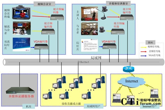 銳取多媒體錄播系統(tǒng)采用了分布式的架構(gòu),前端的視音頻編碼器負(fù)責(zé)視音頻信號的采集,后臺的多媒體錄播服務(wù)器負(fù)責(zé)信號的錄制、直播和點(diǎn)播。多媒體錄播系統(tǒng)可從視頻會議終端上獲取信號,并將視頻會議實(shí)時(shí)直播到?jīng)]有視頻會議終端覆蓋的分行,擴(kuò)大了視頻會議的參與范圍,讓更多的員工可以參加遠(yuǎn)程培訓(xùn)。