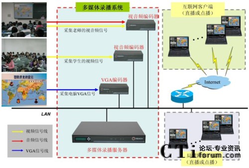 廣州市旅游職業(yè)學(xué)校多媒體錄播系統(tǒng)組網(wǎng)如上圖所示。在本項(xiàng)目中編碼器和多媒體錄播服務(wù)器分別部署在教室和機(jī)房?jī)?nèi),前端的視音頻編碼器采集老師、學(xué)生的視音頻信號(hào),VGA編碼器采集PPT內(nèi)容,編碼器采集信號(hào)并編碼后通過網(wǎng)絡(luò)發(fā)送給多媒體錄播服務(wù)器,多媒體錄播服務(wù)器接收并實(shí)現(xiàn)同步錄制、直播及事后點(diǎn)播。老師、學(xué)生可在教室、辦公室、宿舍等任何可以連接校園網(wǎng)的地方實(shí)時(shí)觀看教室內(nèi)進(jìn)行的課程,可滿足日常多媒體教學(xué)、課件錄制、微格教學(xué)等應(yīng)用的需要。